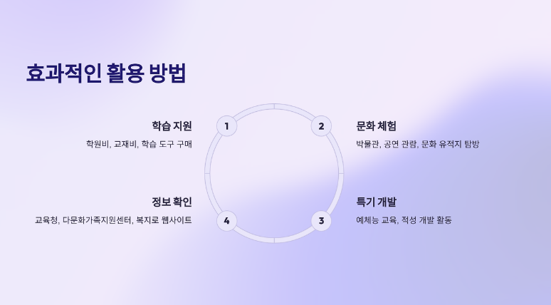 다문화가족 자녀의 학습기회 격차해소와 자아 정체성 형성을 돕기 위한 맞춤형 교육비 지원사업으로 초등학교부터 고등학생까지 전 학령에 걸쳐 지원됩니다.