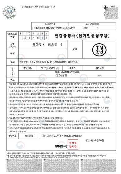 이에 정부 24에서 인감증명서 상단에 있는 16자리 문서확인번호를 입력하거나, 정부 24 앱 또는 스캐너용 문서확인 프로그램으로 하단에 있는 바코드를 스캔하면 증명서의 진위 여부를 확인할 수 있다.