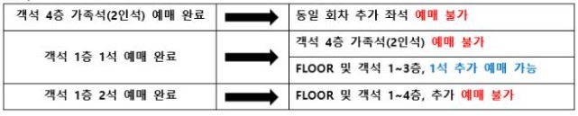 - 가조석(2인석) 예매 시에는 동일 회차에서 추가 좌석 예매가 불가합니다.