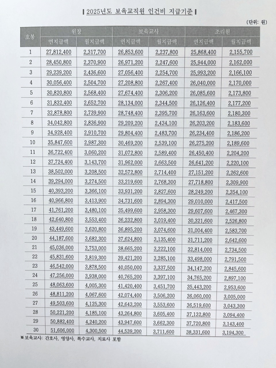 2025년 보육보직원의 호봉표를 공유합니다. 전년 대비 3% 인상이 되면서 물가상승을 반영한 인상인 듯합니다. 고된 일과에 대해 지원구조가 부족하다고 생각되지만 지역별 교사처우개선비가 지급되고 현장에서 수고하시는 보육교직원의 근무환경여건도 개선된다고 하니 기대를 해봅니다.