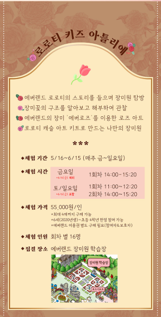 장미터널, 하트조형물, 유럽풍 분수대와 성을 배경으로 한 '장미궁전' 등 다양한 포토존이 마련되어 있습니다. 장미축제 40주년을 맞아 장미원에서 예술모험을 떠날 수 있는 로로티 키즈 아틀리에를 탐방할 수 있습니다.